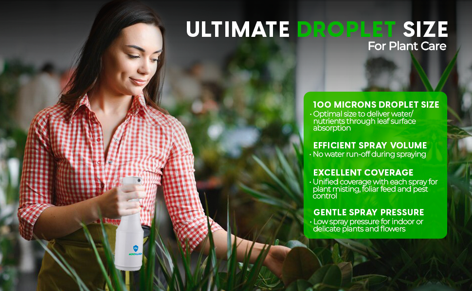 Due to its super fine droplet size, our sprayer provides excellent, uniform coverage without runoff. We recommend using it as a mister for indoor plants and for foliar feeding.
