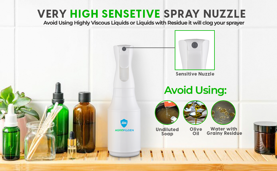 This type of sprayer has a very sensitive nozzle. We only recommend using very low viscosity liquids such as water, vinegar, alcohol, or liquid nutrients mixed with water. Oils, high viscosity liquids, or liquids with debris will clog and damage the nozzle.