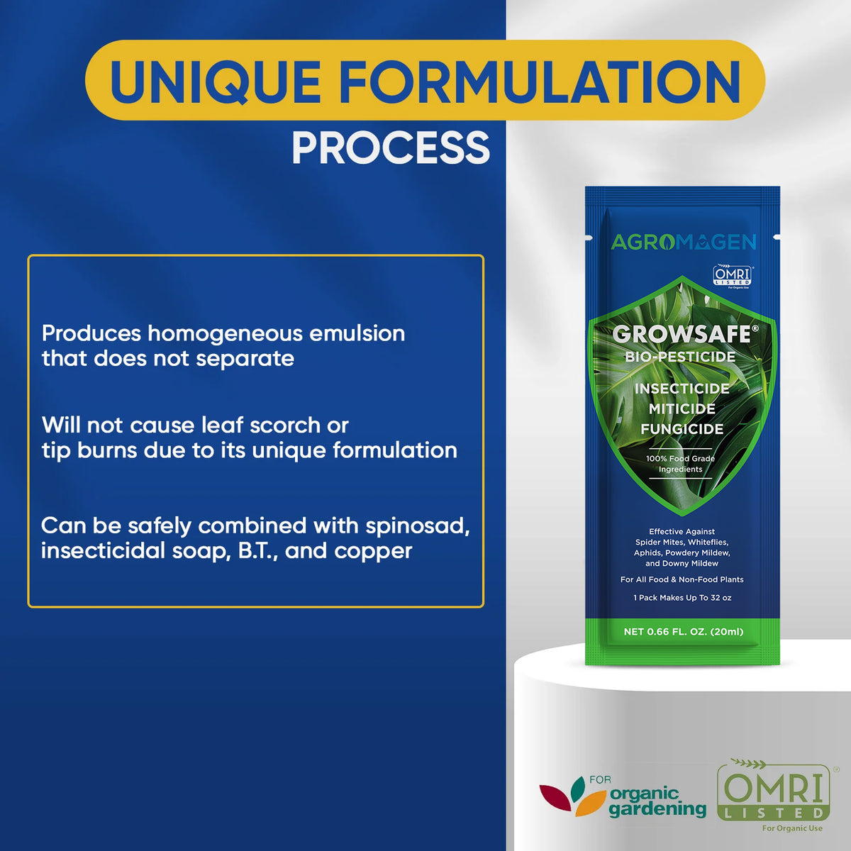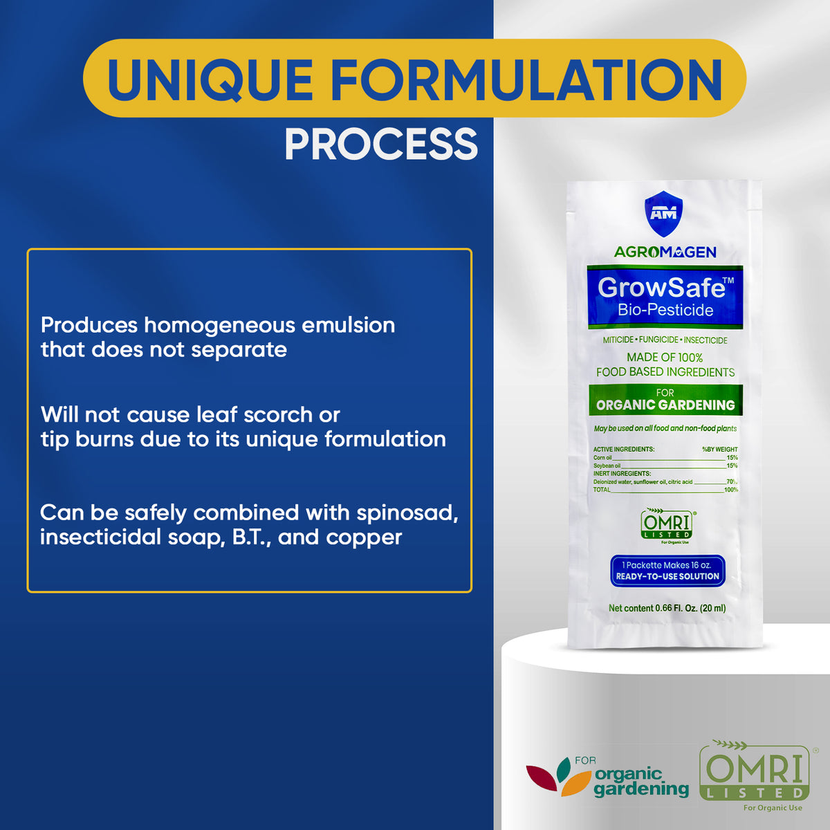 - The unified and stable oil blends better and is safer than other oils for plants; it mixes easily with water without separation and does not burn or suffocate the leaves, affect the plant’s development, or change the fruit’s taste or flavor.